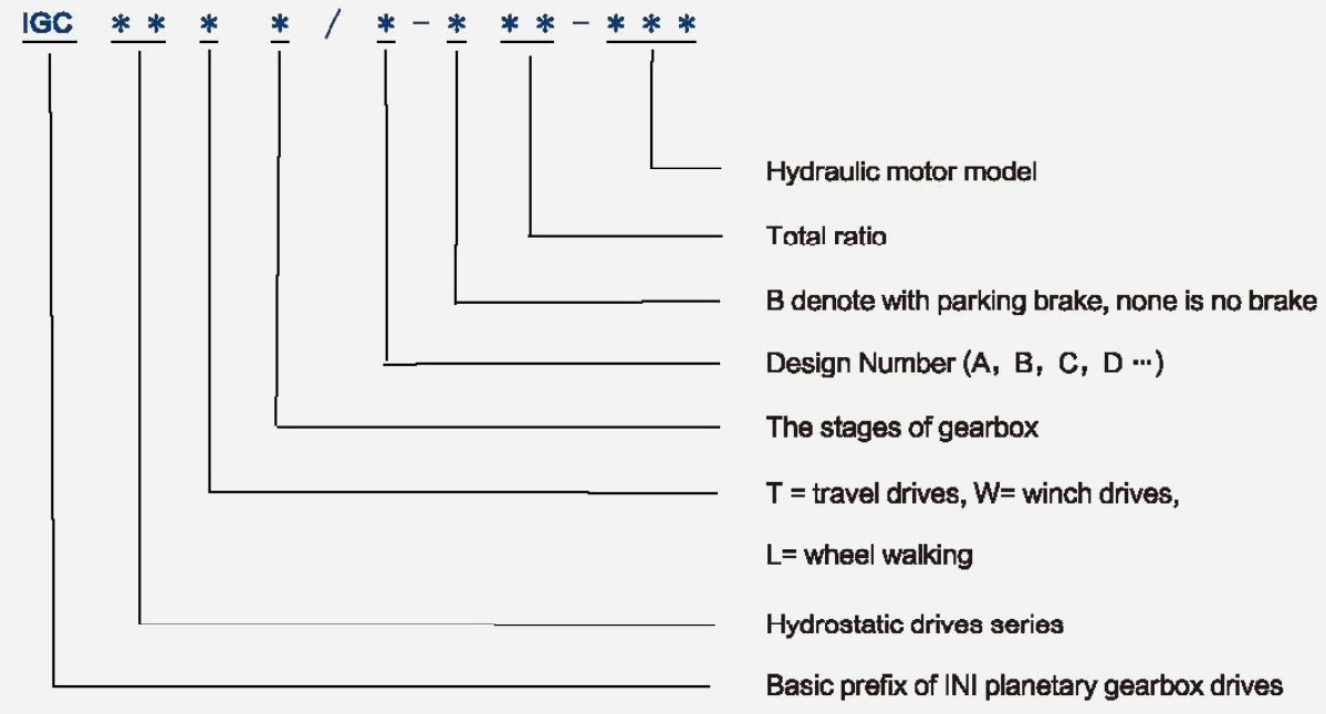| Kod bersiri | Tork Keluaran | Nisbah | Motor Hidraulik | Kelajuan Iopot Maks | Tork Brek | Hrake Tekan | Berat badan | |